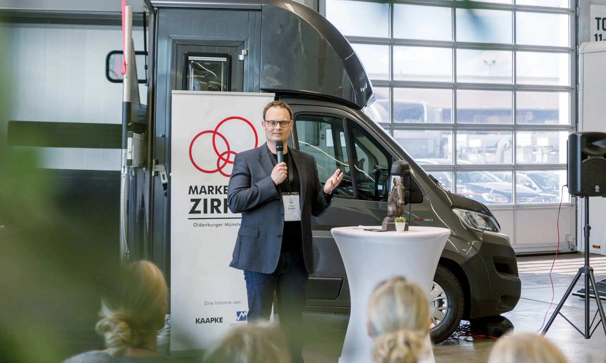 Nach kurzer Begrüßung, dem Warming-Up, im beeindruckenden Showroom des Böckmann Horse Truck Centers, folgte der Marketing-Talk: ein Interview mit Initiator Timo Kaapke und dem diesmaligen Gastgeber Klaus Böckmann. Im Gespräch gewährte Böckmann nicht nur exklusive Einblicke in das eigene Marketing des erfolgreichen Familienunternehmens. Er berichtete ebenfalls über die Marke Böckmann, die für erstklassige Qualität made in Germany steht, traditionelles Handwerk bewahrt und zugleich weltweit für Innovationen sorgt.