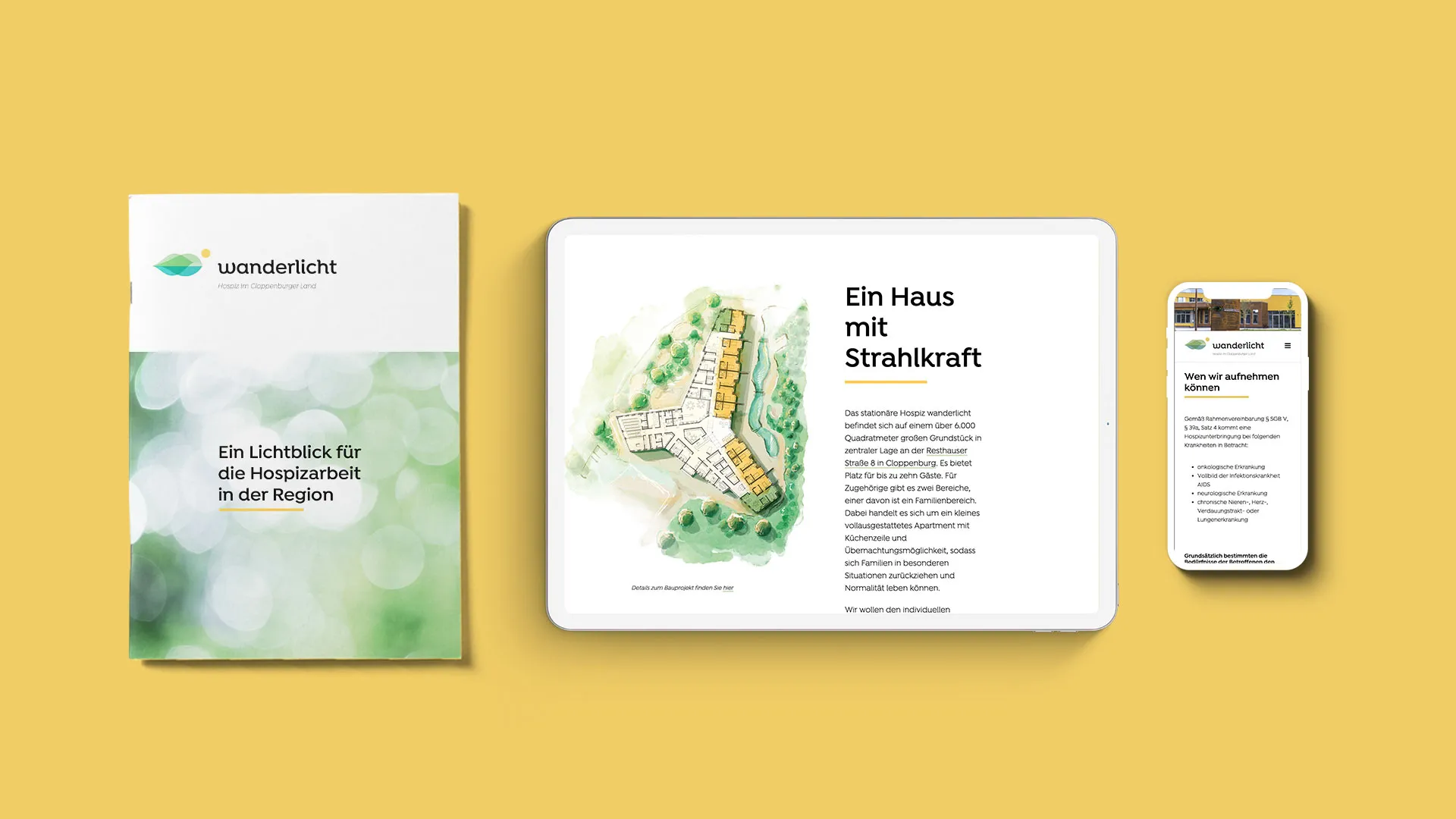 In einem strategischen Markenentwicklungsprojekt haben wir gemeinsam mit den Vorstandsmitgliedern der Kleebaum Stiftung die Identität des Hospizes herausgearbeitet. Aus ihr heraus entwickelten wir die Positionierung und darauf aufbauend die Wort- und Bildmarke „wanderlicht“. Das Wort „wander“ steht dabei für Wanderschaft. Es beschreibt die verschiedenen Lebensphasen und besonders die Phase des Abschiednehmens und Sterbens. Das Wort „licht“ steht für Orientierung und symbolisiert Wärme, Nähe und Geborgenheit.